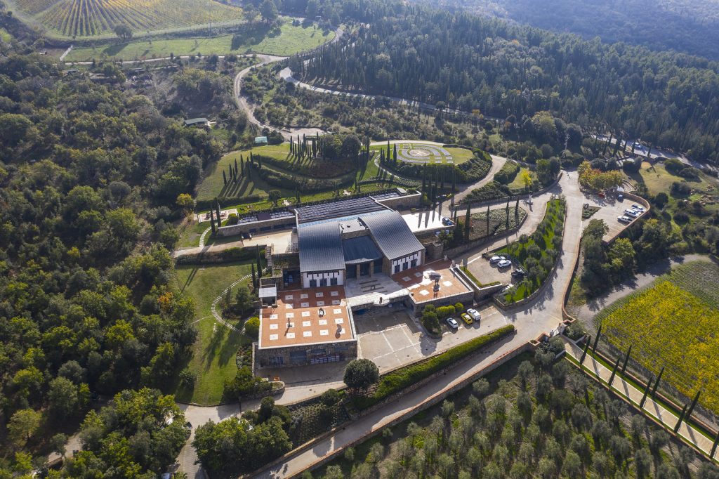 To avoid compactization, one of Forte’s companies developed ultralight tractors, whose pressure is lower than a human’s feet. Intelligent hydrogeological management, including an ingenious system with channels and three artificial lakes provide in the water need. Leaf management has a whole new dimension at Podere Forte. It features twenty-three kilometers of foldable tents for sun protection. The twenty-seven employed vineyard workers are equipped with electrified orthogonal seated wheelchairs.