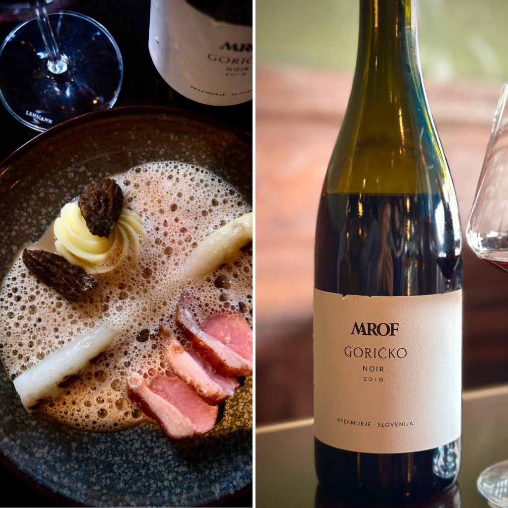 Marof Goričko Noir × Lamb Back Fillet with White Asparagus, Morels, and Roasted Garlic Sauce.